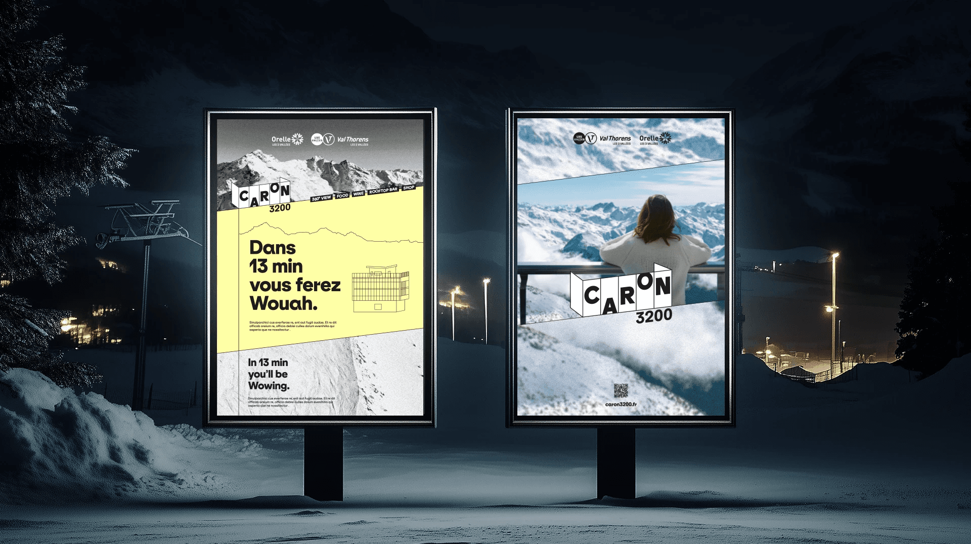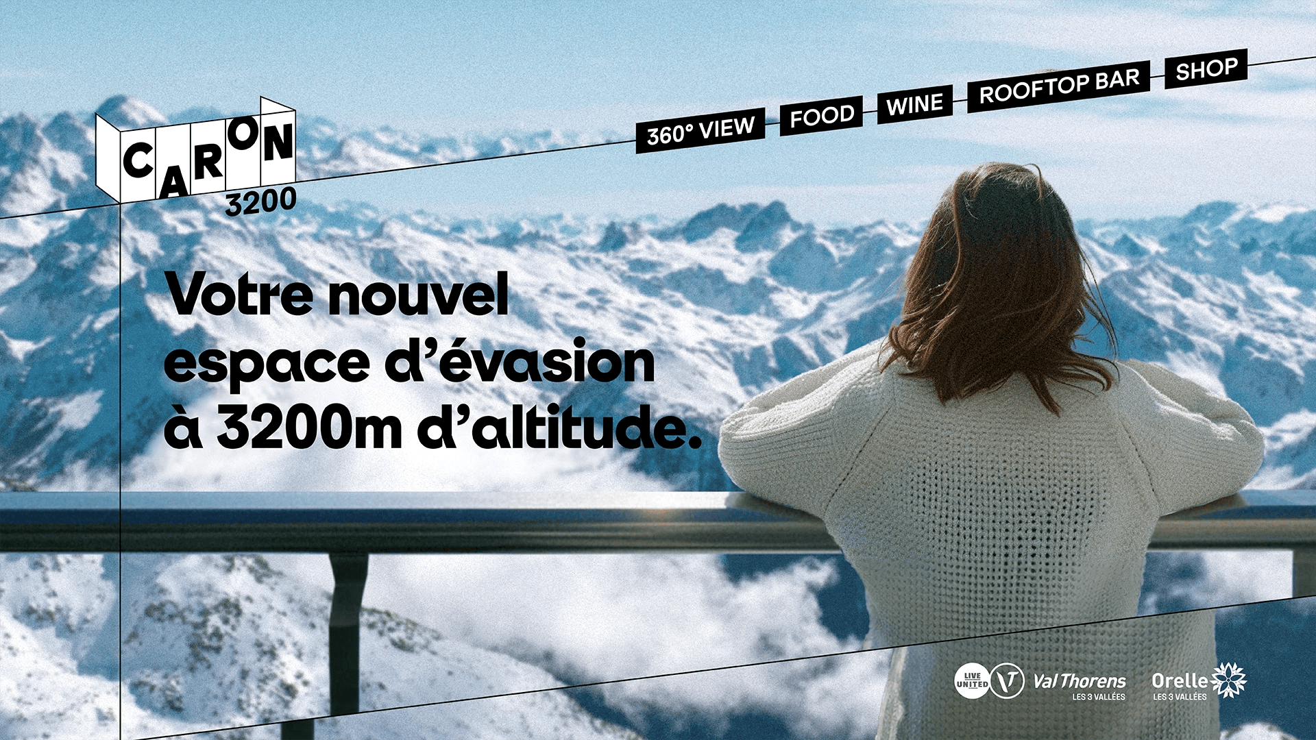 Un logo évocateur : le logo représente ces murs vitrés statiques avec des lettres qui montent et descendent, illustrant le mouvement à l'intérieur d'un bâtiment immobile. Le prolongement des lignes dans le système graphique évoque la montée depuis Orelle ou Val Thorens et l'horizon.