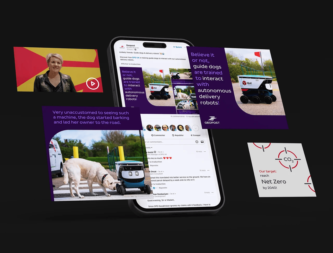 Structuration d’une équipe pour l’accompagnement quotidien de Geopost dans la production de contenus avec mise en place d'instances de pilotage, production des contenus (rédactionnel, graphisme, vidéo…) et accompagnement au suivi de la performance.